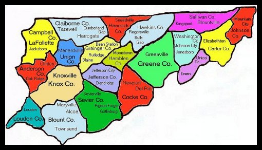 Follow the links below to view info on that County.( map below is for county orientation, for better map go to East TN Area Map, over 500k and may take a little to download, well worth it if you need a good area map)
